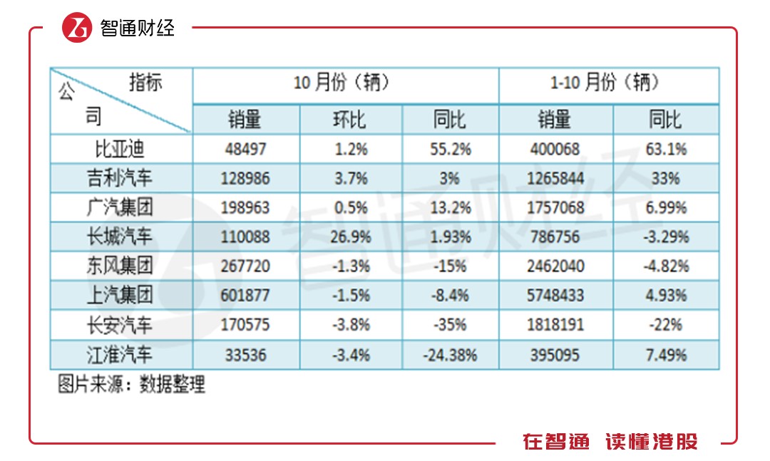 目前大部分車(chē)企基本都公布了10月份及首10個(gè)月的汽車(chē)銷(xiāo)量情況,智通財(cái)經(jīng)APP將這些公布銷(xiāo)量的車(chē)企整理如下表: