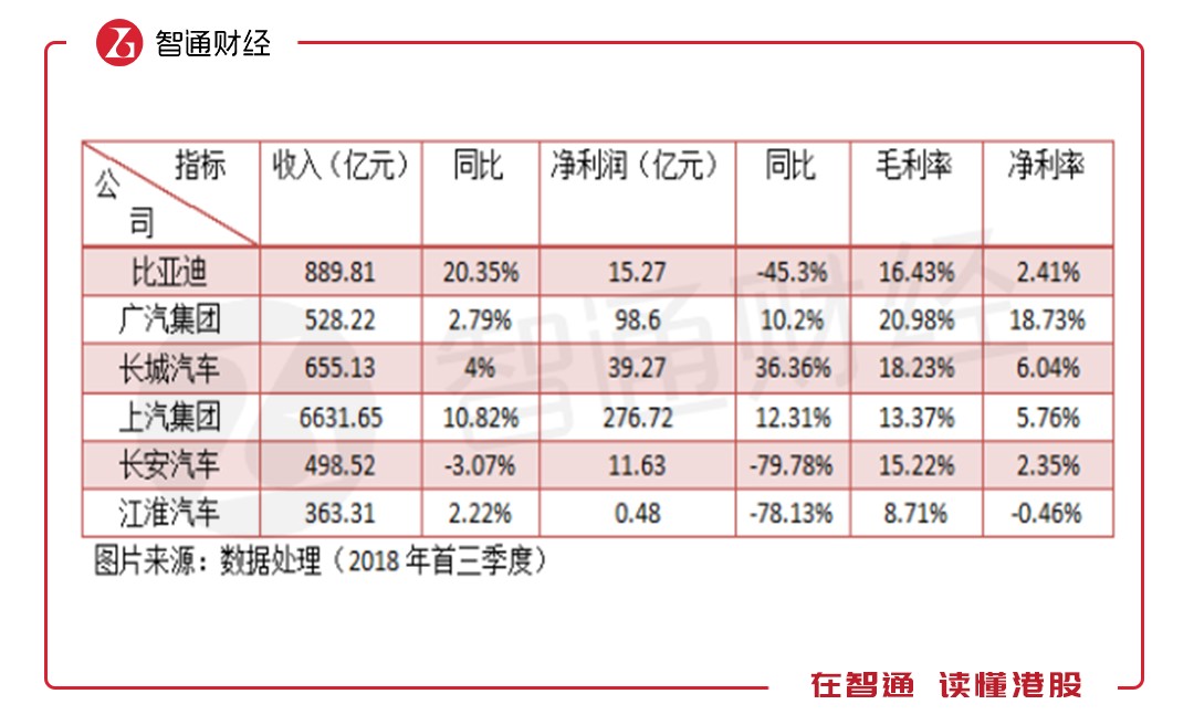 從抽樣的標(biāo)的看,2018年首三季度比亞迪(01211)的收入增速是最快的,其次是上汽集團(tuán),其余標(biāo)的增速單位數(shù)甚至是負(fù)增長(zhǎng),在此次標(biāo)的中,沒(méi)有自主品牌龍頭吉利汽車(chē)(00175),不過(guò)以該公司上半年的收入增速看,和比亞迪是同一個(gè)高增長(zhǎng)賽道。在盈利上,各個(gè)車(chē)企差異還是挺大的,不過(guò),在這塊操作靈活性較大。