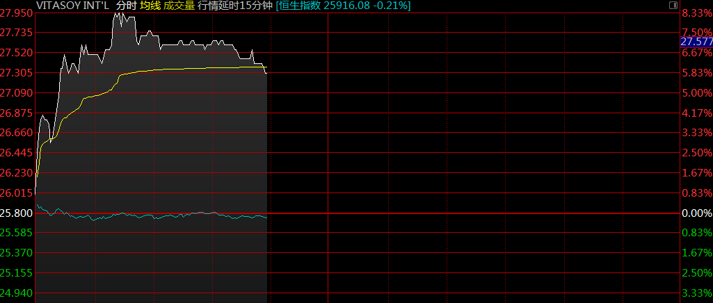 智通財(cái)經(jīng)APP獲悉,維他奶國(guó)際(00345)昨日午間公布中期業(yè)績(jī),中期股東應(yīng)占利潤(rùn)同比增長(zhǎng)30%至5.18億港元,超市場(chǎng)預(yù)期。早盤(pán)股價(jià)漲勢(shì)延續(xù),截至9時(shí)56分,漲6.59%,報(bào)價(jià)27.5港元,成交額3661.58萬(wàn)。