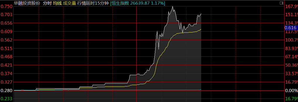 智通財經(jīng)APP獲悉,委任于猛為執(zhí)行董事及董事會主席,華融投資股份(02277)午后股價暴漲,截至13時46分,漲157.14%,報價0.72港元,成交額651.69萬。