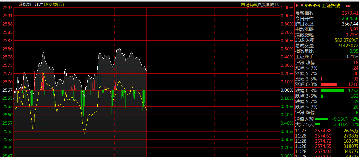截至早盤收盤,上證指數(shù)報(bào)2573點(diǎn),漲0.23%;深證成指報(bào)7602點(diǎn),漲0.08%;創(chuàng)業(yè)板指數(shù)報(bào)1312點(diǎn),跌0.01%。