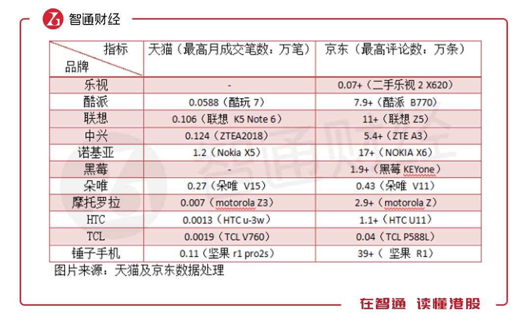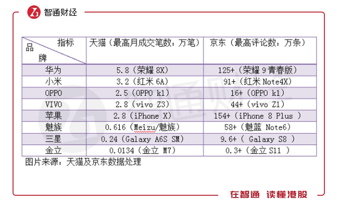電商的崛起讓手機多了一條網絡強大的銷售渠道,目前天貓和京東是電商平臺中的兩大巨頭,國內的最終商品基本在這兩大平臺售賣。智通財經APP通過天貓及京東相對應的月成交筆數及評論數了解不同品牌的智能手機售賣情況。