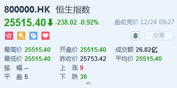 智通財經(jīng)APP獲悉,恒生指數(shù)開盤跌238.02點或0.92%,報25515.4點。國企指數(shù)跌1.1%,報9990.09點。紅籌指數(shù)跌0.91%,報4086.09點。大市盤前成交26.82億港元。因圣誕節(jié)假期,港股通北向關閉,港股今日僅上午開市,下午休市。12月25日(星期二)及26日(星期三)則全天休市,之后恢復正常。
