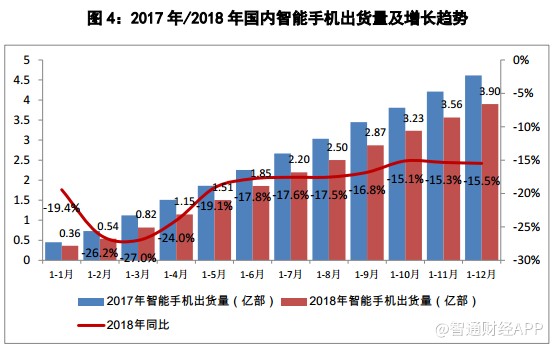 2018年全年,智能手機出貨量3.90億部,同比下降15.5%,占同期手機出貨量的94.1%,其中Android手機在智能手機中占比89.3%。