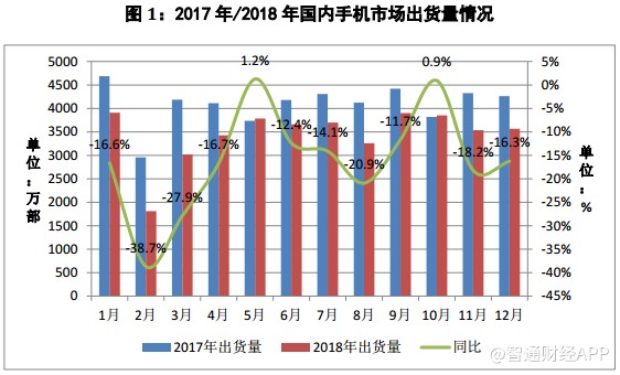智通財經(jīng)APP獲悉,中國信通院發(fā)布12月份國內(nèi)手機出貨量報告,2018年12月,國內(nèi)手機市場總體出貨量3567.4萬部,同比下降16.3%,環(huán)比增長0.9%;2018年全年,國內(nèi)手機市場總體出貨量4.14億部,同比下降15.6%。