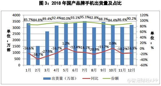 2018年全年,國產(chǎn)品牌手機出貨量3.71億部,同比下降14.9%,占同期手機出貨量的89.5%;上市新機型695款,同比下降29.4%,占同期手機上市新機型數(shù)量的91.0%。