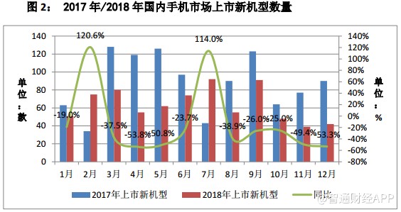 2018年全年,智能手機上市新機型587款,同比下降26.5%,占同期上市新機型數(shù)量的76.8%,其中支持Android操作系統(tǒng)的手機569款。(劉瑞)
