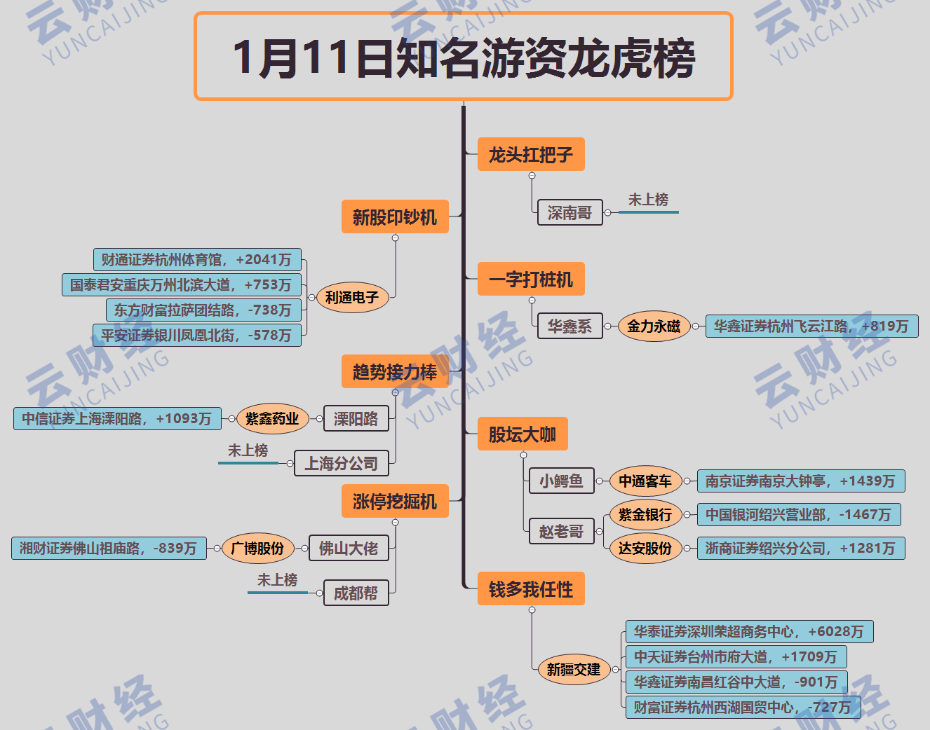 其他游資方面,趙老哥買入達安股份(300635)1281萬賣出紫金銀行(601860)1467萬,小鱷魚買入中通客車(000957)1439萬,佛山幫賣出廣博股份(002103)839萬。