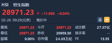 智通財經(jīng)APP獲悉,恒生指數(shù)開盤漲0.04%%,報28971.23點。國企指數(shù)張0.19%,報11653.15點。紅籌指數(shù)張0.13%,報4565.49點。大市盤前成交27.87億港元。隔夜美股小幅收漲,大型科技股集體收漲,港股ADR指數(shù)全日僅微升。
