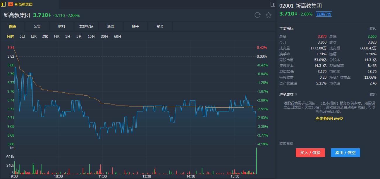 新高教日前公布,以先舊后新方式配售1.1億股,占擴(kuò)大后已發(fā)行股本約7.14%,每股配售價(jià)為3.57元,較上日收市價(jià)3.93元,折讓約9.2%。所得款項(xiàng)凈額預(yù)期約3.89億元,擬用作償還債務(wù)及一般企業(yè)用途。配售完成后,除承配人外的公眾股東持股比例,將由44.66%降至41.47%。
