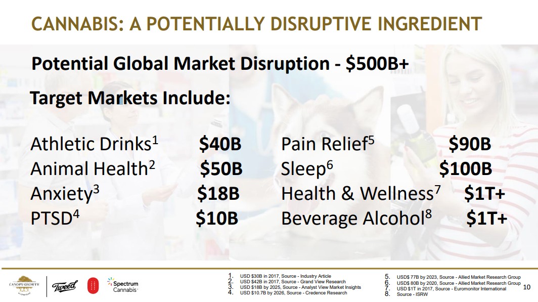 CANOPY GROWTH根據(jù)Allied Market Research Group等調(diào)研機(jī)構(gòu)按照不同用途做了一組測算,未來該行業(yè)的將會滲透全球至少5000億美元的市場: