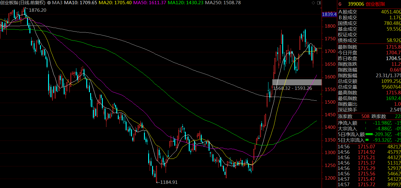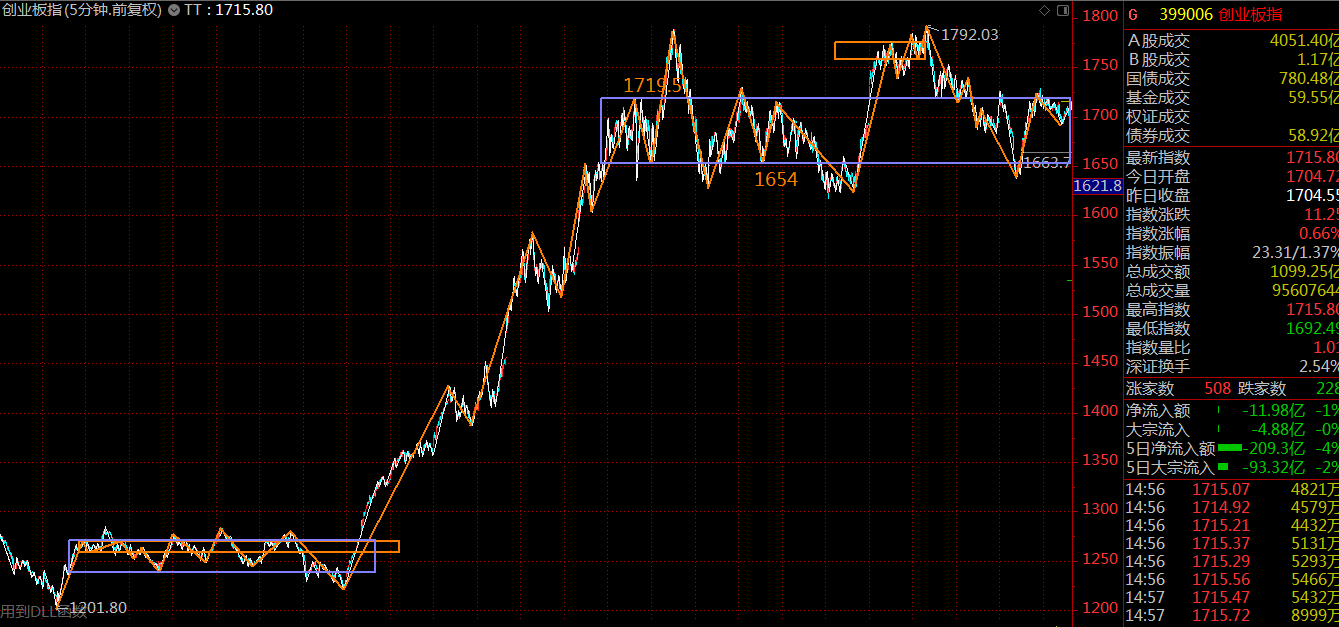創(chuàng)業(yè)板這里走弱了已經(jīng),上周一、周二的調整打到了中樞下軌,這是一次警告,上拉后始終不能站上中樞上軌,是為弱勢,本周關注1654點的支撐,謹防第三類賣點的出現(xiàn)。