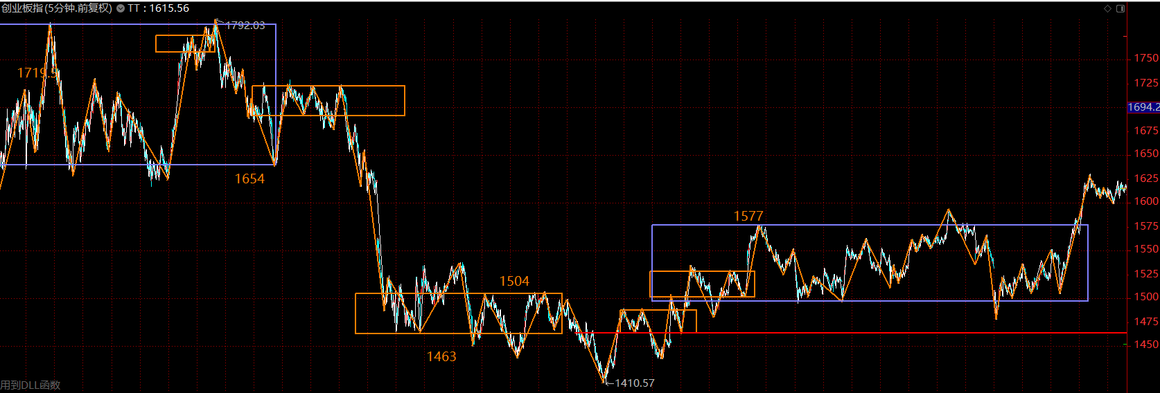 創(chuàng)業(yè)板這里在構(gòu)建30分鐘級(jí)別的三買,周一如果不跌破1577點(diǎn),這里將是創(chuàng)業(yè)板主升行情的起點(diǎn)。如若重新跌回中樞內(nèi)部,則按中樞震蕩處理。創(chuàng)業(yè)板走勢(shì)要強(qiáng)于主板很多,后續(xù)行情多半仍然圍繞創(chuàng)業(yè)板展開。