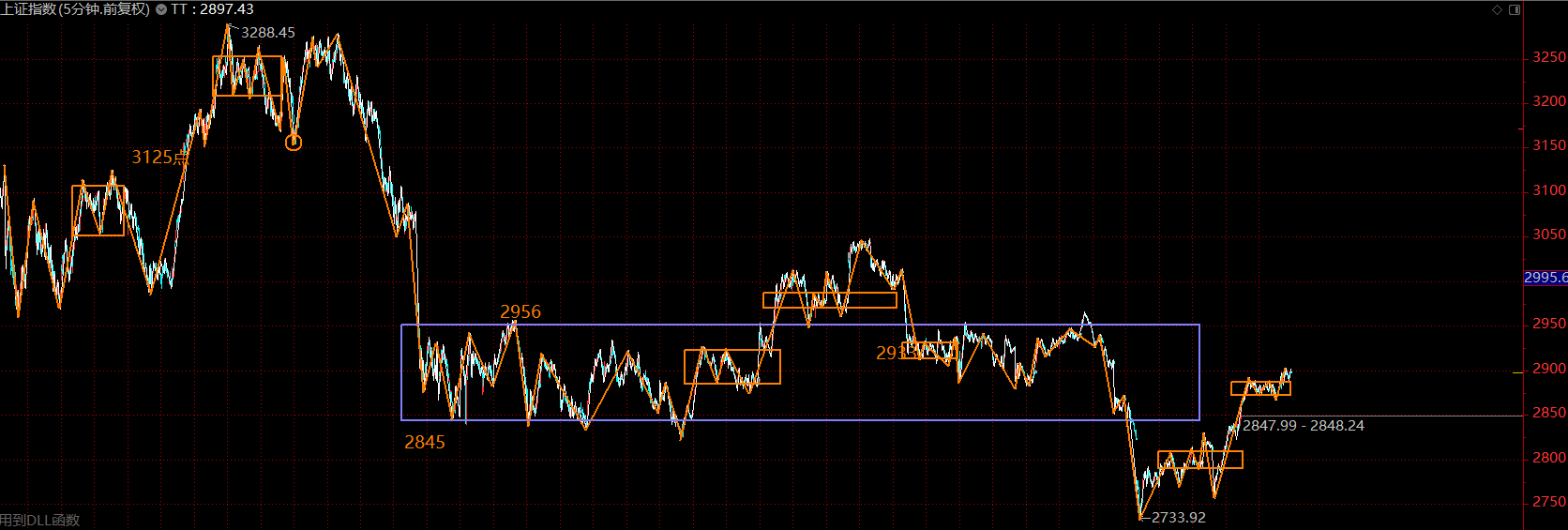結(jié)合周五盤后的消息,這里五分鐘的上漲趨勢(shì)應(yīng)該已經(jīng)結(jié)束,市場(chǎng)強(qiáng)于預(yù)期,并沒有在中樞下方結(jié)束這段上漲趨勢(shì),而且在中樞的中部,回落后,如果不創(chuàng)新低,則構(gòu)成大級(jí)別的二買,中期大行情可期。短期這里可能會(huì)面臨一波回落,周一早盤如果開在2845上方,則可持股不動(dòng),如果低于2845點(diǎn),則可在上拉時(shí)適度減倉(cāng),后續(xù)在2733與2800之間擇機(jī)回補(bǔ)。