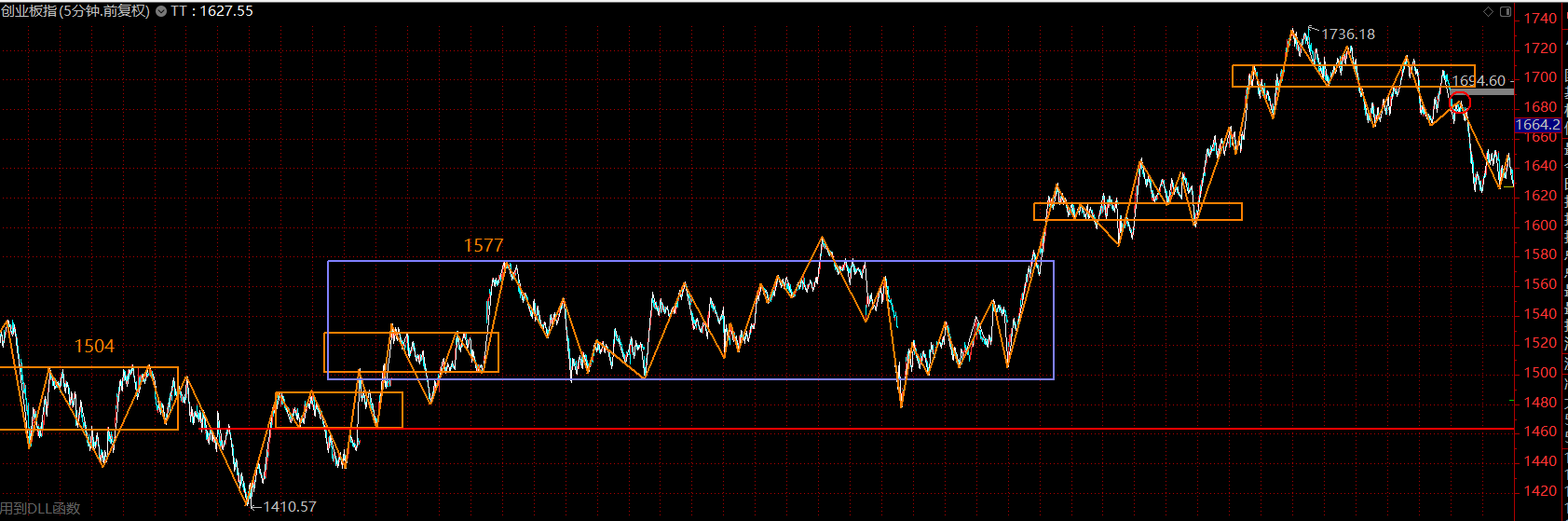 本輪行情的領(lǐng)先指數(shù)——創(chuàng)業(yè)板指數(shù)仍舊為多頭排列,目前同樣進(jìn)入了五分鐘下跌趨勢第二個中樞的構(gòu)建過程,可依托1600-1620區(qū)域展開布局。