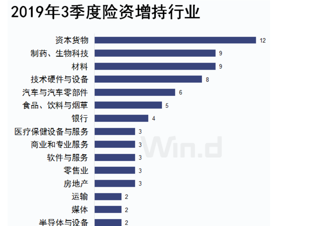 險資財大氣粗,其一舉一動受到資本市場密切關注:據(jù)Wind數(shù)據(jù)統(tǒng)計,截止2019年3季度末,兩市共有376家上市公司被險資持有,持有股數(shù)約為833.21億股;132只保險產(chǎn)品共持有約12380億元市值A股股票。資本貨物、醫(yī)藥、軟硬件、食品等獲重點增持。