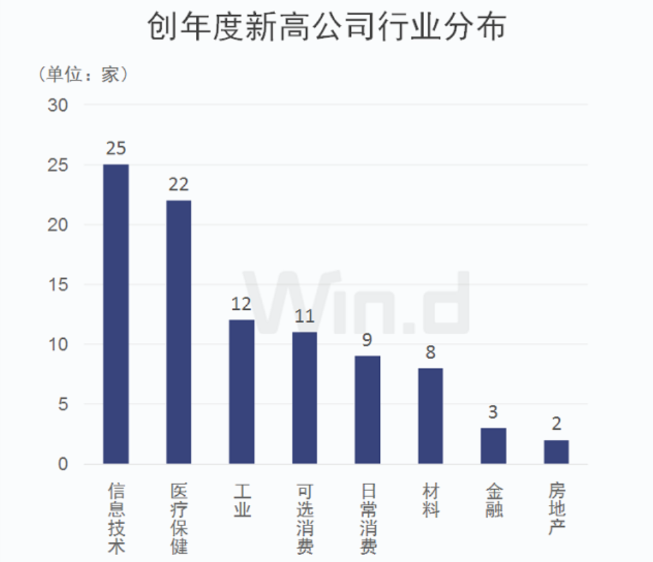 Wind統(tǒng)計顯示,有92家公司近3日最高股價創(chuàng)今年以來新高。從相關(guān)公司行業(yè)分布來看,信息技術(shù)類最多,有25家;醫(yī)療保健行業(yè)緊隨其后,有22家,工業(yè)、可選消費(fèi)均有超過10家公司。可見,科技和生物醫(yī)藥類公司成為牛股聚集地。