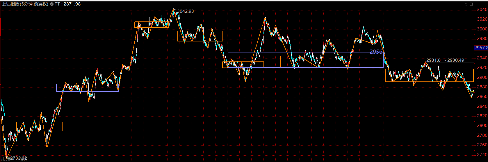 上證指數(shù)上周在等待中樞擴展完成后破位下跌,破位力度比較小,而對結(jié)構(gòu)分解后發(fā)現(xiàn),這次大中樞的盤整背馳,第一段以五分鐘趨勢的形式完成,第二段以盤整的形式完成,且已進入了尾聲。因此,料此輪主跌段不會太久,繼續(xù)維持在前序中樞下軌2850附近企穩(wěn)的判斷。