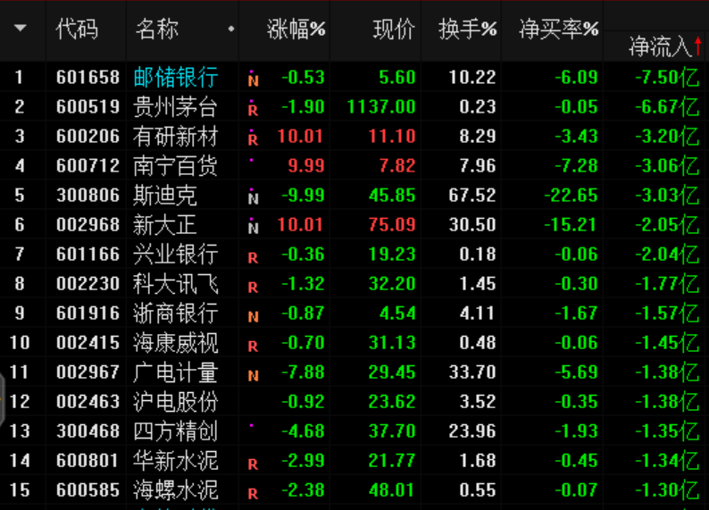 兩市資金流向:凈流入、流出排名:
