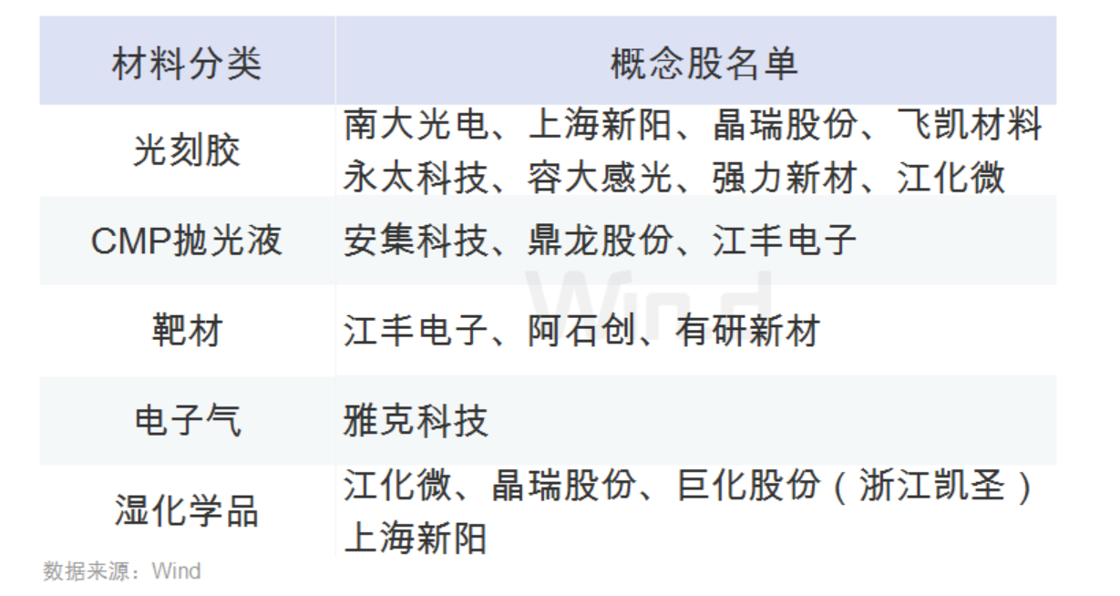 關(guān)注光刻膠:光刻是整個(gè)集成電路制造過(guò)程中耗時(shí)最長(zhǎng)、難度最大的工藝,耗時(shí)占IC制造50%左右,成本約占IC生產(chǎn)成本的1/3。從需求端來(lái)看,光刻膠可分為半導(dǎo)體光刻膠、面板光刻膠和PCB光刻膠。其中,半導(dǎo)體光刻膠的技術(shù)壁壘最高。目前全球光刻膠市場(chǎng)基本被日本和美國(guó)企業(yè)所壟斷。國(guó)內(nèi)生產(chǎn)的光刻膠中,PCB光刻膠占比94%,LCD光刻膠和半導(dǎo)體光刻膠占比分別僅有3%和2%。國(guó)內(nèi)PCB光刻膠國(guó)產(chǎn)替代進(jìn)度快,面板光刻膠和半導(dǎo)體光刻膠與國(guó)外相比仍有較大差距。