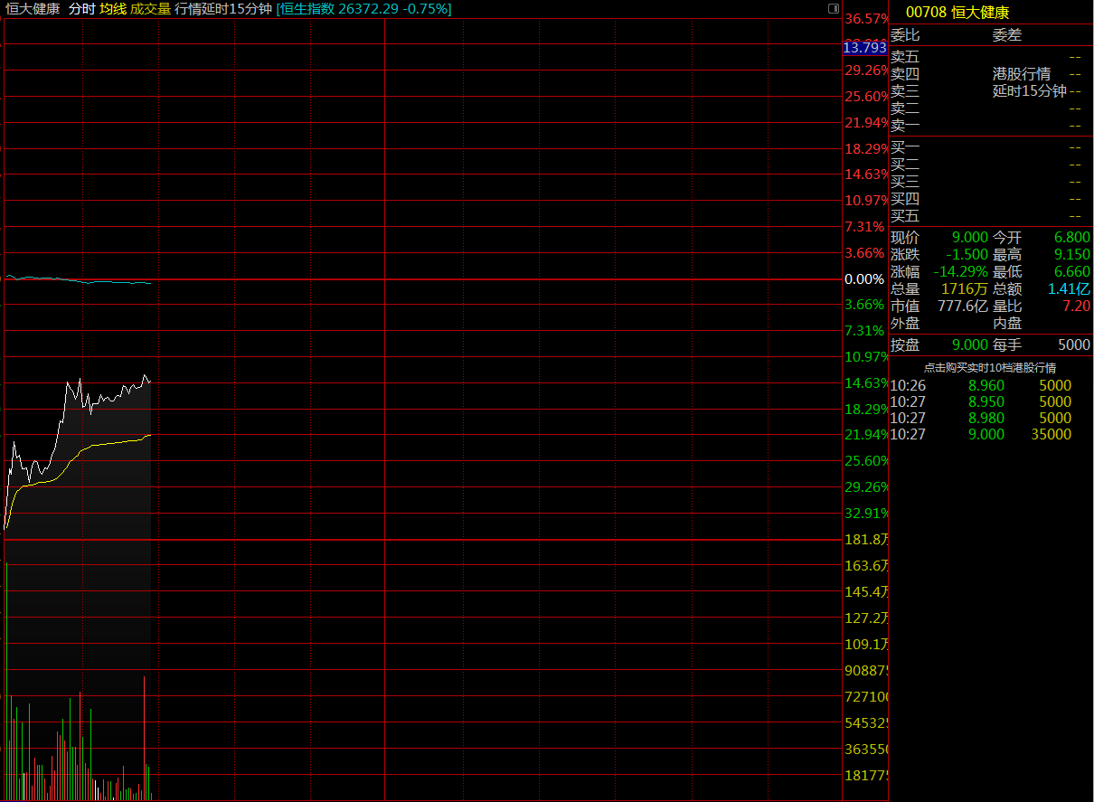 智通財(cái)經(jīng)APP獲悉,恒大健康(00708)今日復(fù)牌,盤(pán)前股價(jià)下跌,截至9時(shí)20分,跌35.24%,報(bào)價(jià)6.8港元,成交額299.2萬(wàn)。