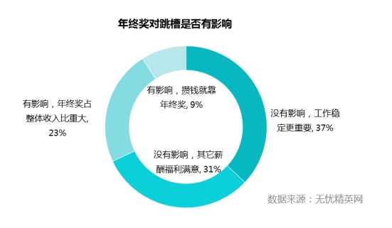 但是即便大部分人對今年的年終獎的增長沒有信心,卻很難讓他們因?yàn)槟杲K獎而跳槽。半數(shù)以上的受訪者年終獎?wù)既晔杖氲谋壤齼H為20%左右,即便不滿意年終獎,但工作的穩(wěn)定性、工作環(huán)境、企業(yè)福利是他們更看重的要素。有3成受訪者表示收入依賴年終獎,如果年終獎不滿意一定會尋找機(jī)會跳槽。因此企業(yè)在人才管理上,需要特別注意年終獎對于員工保留的影響,提前做好預(yù)防工作。
