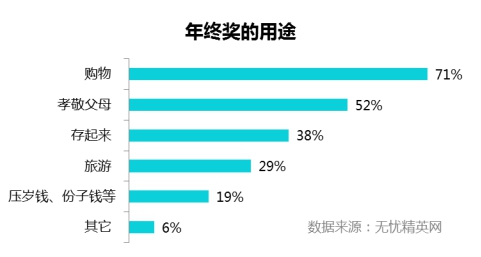 在年終獎的使用上,71%的人會用于購物,52%的人會用于孝敬父母,38%的人會將年終獎存一部分起來,29%的會用于旅行。超過一半的人,以上年終獎的使用類別超過了3項(xiàng),人生的那點(diǎn)小夢想,全仰仗年終獎?!捌綍r(shí)每個(gè)月還完房貸,收入只夠生活,提升生活質(zhì)量,全靠年終獎,去年的年終獎,我給自己買了臺蘋果筆記本電腦;今年的年終獎,準(zhǔn)備用來去普吉島旅行,沒有年終獎肯定要哭死?!?剛在上海買了房的小杰告訴我們。