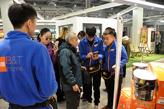 3月3日上午,百安居北京金四季店的工作人員幫顧客注冊會(huì)員。