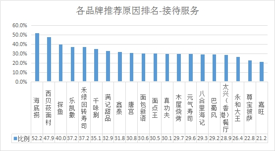 接待服務(wù)推薦率排名:排名前三的是海底撈、西貝筱面村、探魚;