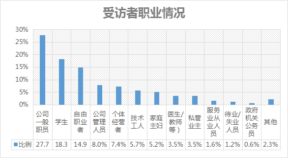 本次調(diào)研中,公司一般職員的比例最高,為27.7%,其次是學(xué)生,占比為18.3%。53.9%的受訪者其個(gè)人月收入超過5000元。