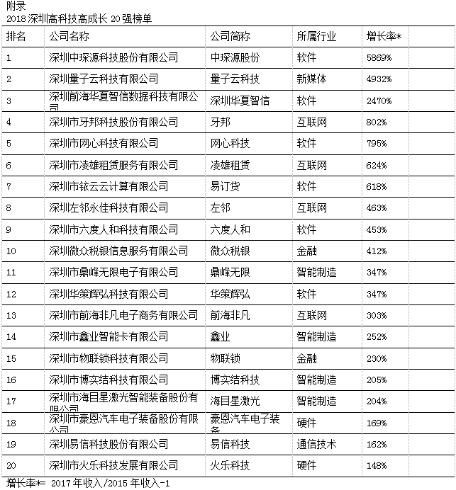 今年,榮登“深圳20強(qiáng)”三甲的獲獎(jiǎng)企業(yè)分別為深圳中琛源科技股份有限公司、深圳量子云科技有限公司和深圳前海華夏智信數(shù)據(jù)科技有限公司,他們?cè)谶^(guò)去三年中表現(xiàn)出的平均增長(zhǎng)率分別為5,869%、4,932%和2,470%。本年度入選“深圳20強(qiáng)”的企業(yè)除了軟件、硬件、互聯(lián)網(wǎng)和通訊技術(shù)外,也不乏其他新興領(lǐng)域,如新媒體、智能制造和金融科技。此外,為表彰深圳市當(dāng)?shù)乇憩F(xiàn)優(yōu)秀且極具潛力的初創(chuàng)企業(yè),今年共有20家企業(yè)獲選“深圳明日之星”,它們來(lái)自多個(gè)不同的領(lǐng)域,包括人工智能、智能設(shè)備、電子商務(wù)、教育、生物醫(yī)藥、金融科技和互聯(lián)網(wǎng)平臺(tái)服務(wù)等 (詳見(jiàn)附錄)。獲選成為“深圳20強(qiáng)”和“深圳明日之星”的企業(yè),將自動(dòng)成為“中國(guó)高科技高成長(zhǎng)50強(qiáng)”(簡(jiǎn)稱“中國(guó)50強(qiáng)”)和“中國(guó)明日之星”的候選企業(yè),并在今年11月與全國(guó)其他入圍企業(yè)角逐,躋身全國(guó)增長(zhǎng)最快、最具發(fā)展?jié)摿Φ母呖萍计髽I(yè)之列。