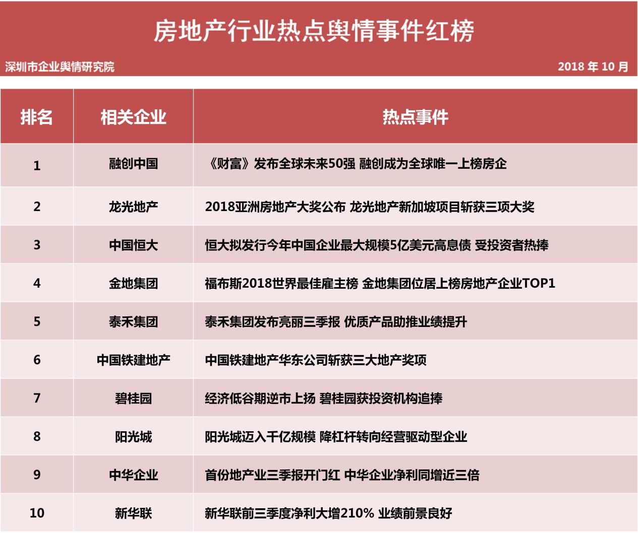 本榜單主要通過計算機系統(tǒng)對輿情數據的自動采集、整理和分析,結合輿情分析師的篩選和研判,對2018年10月1日至10月31日這一時段內房地產領域的熱點輿情事件作出綜合評估,主要評估指標包含新聞報道指數、微博擴散指數、論壇參與指數、境外炒作指數。