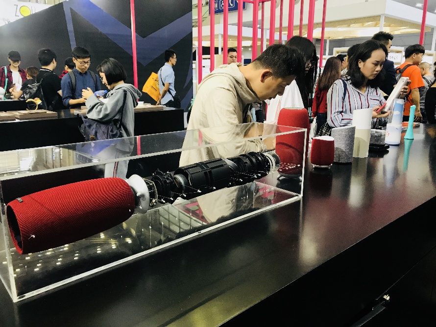 現場展出的小雅AI音箱是國內首款全內容智能音箱,是洛可可為喜馬拉雅所設計。設計過程中的眾創(chuàng)環(huán)節(jié)覆蓋了37.5萬用戶,2.5萬用戶直接參與。洛可可助力喜馬拉雅將內容載體從APP“搬到了”產品中,拉開了國內音箱創(chuàng)新變革的帷幕。而現場展出的曉雅mini AI音箱則是迭新之作,產品的底部使用穩(wěn)定的三腳支撐設計,減小與桌面的接觸面積,有效避免共振現象引起的音質受損。