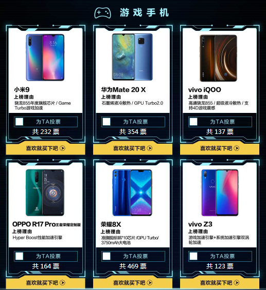 而游戲手機(jī)候選產(chǎn)品則包括:小米9、華為Mate20 X、vivo iQOO、OPPO R17 Pro王者榮耀定制版、榮耀8X、vivo Z3六強(qiáng)爭霸,同樣截至3月12日,第一天的投票中,榮耀8X脫穎而出,暫時領(lǐng)先。