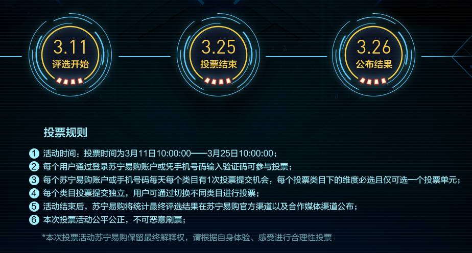 3月11日用戶投票評選開始,3月25日投票結(jié)束,26日正式公布投票結(jié)果,活動貫穿蘇寧易購315全民煥新節(jié)期間,面對眾多手機(jī)、電腦、數(shù)碼新品,用戶會作何選擇?