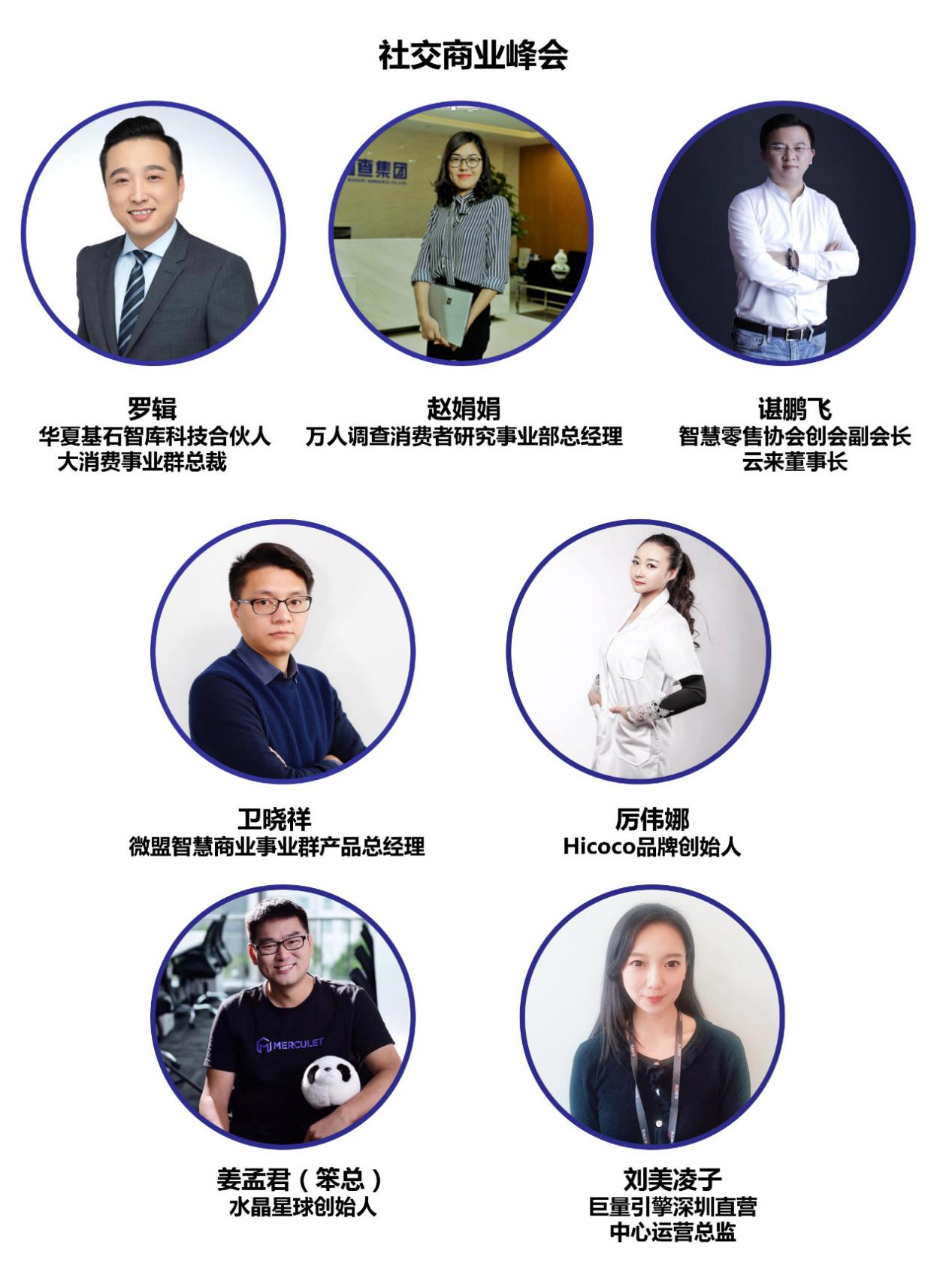 10月30日14:00—17:00(宴會廳Ⅲ)舉行社交電商峰會,華夏基石智庫科技合伙人、大消費事業(yè)群總裁羅 輯主持峰會。萬人調查消費者研究事業(yè)部總經理趙娟娟演講主題《2019年深圳市消費者線上線下渠道消費洞察》,智慧零售協(xié)會創(chuàng)會副會長、特聘專家;云來董事長諶鵬飛演講主題《私域流量社交商業(yè)模式解碼》,微盟智慧商業(yè)事業(yè)群產品總經理衛(wèi)曉祥演講主題《企業(yè)布局社交電商的四種模式》,Hicoco品牌創(chuàng)始人厲偉娜演講主題《說說美業(yè)那些事》,水晶星球創(chuàng)始人姜孟君演講主題《社群時代的影響力和業(yè)績增長》,巨量引擎深圳直營中心運營總監(jiān)劉美凌子演講主題《D造營銷新零售助力品牌升級布局》