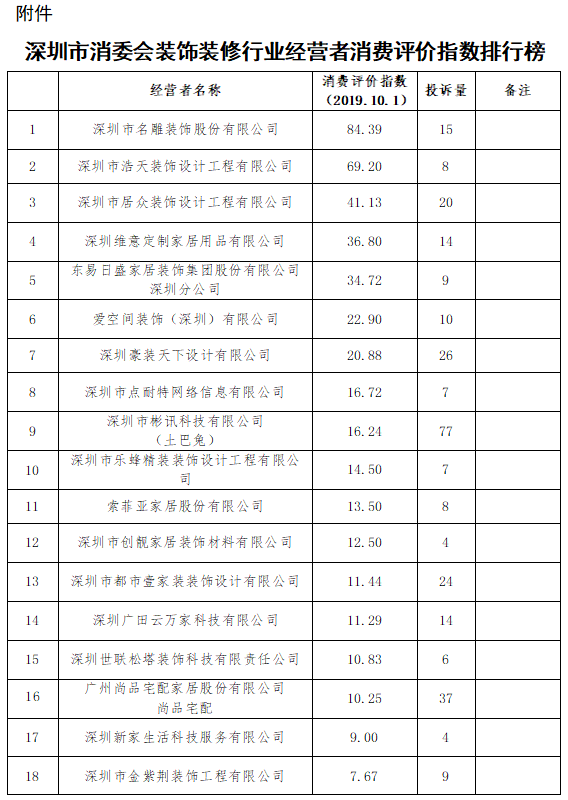11月20日,深圳市消費者委員會(以下簡稱“深圳市消委會”)首次發(fā)布深圳市消委會裝飾裝修行業(yè)消費評價指數排行榜。榜單旨在敦促裝飾裝修行業(yè)經營者提升商品和服務質量,為消費者提供裝飾裝修消費指引,營造安全放心的消費環(huán)境。