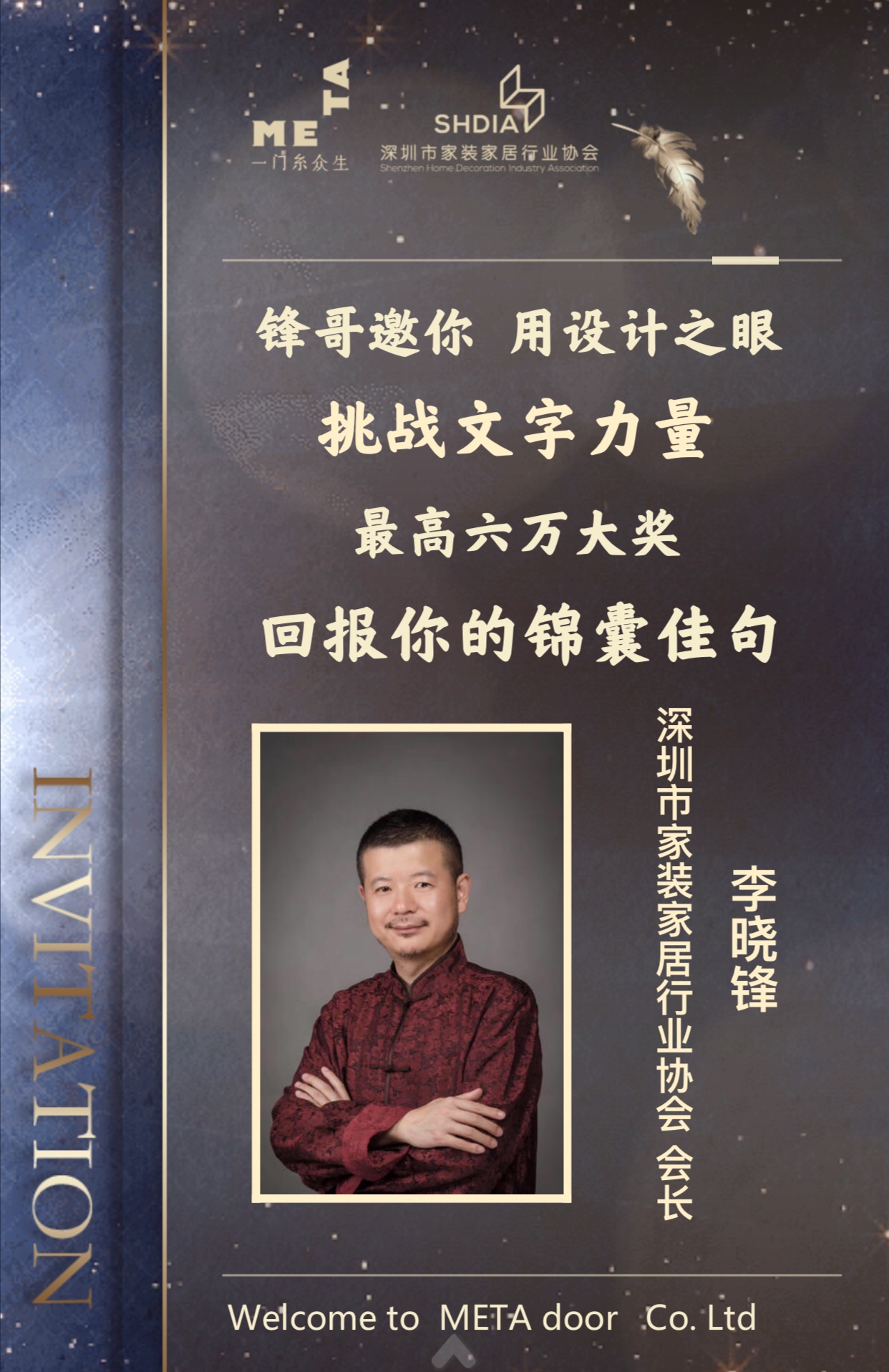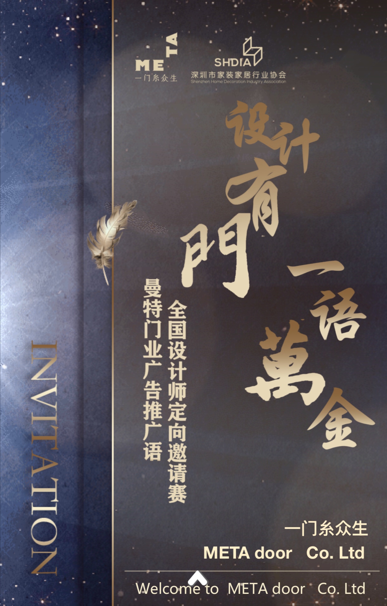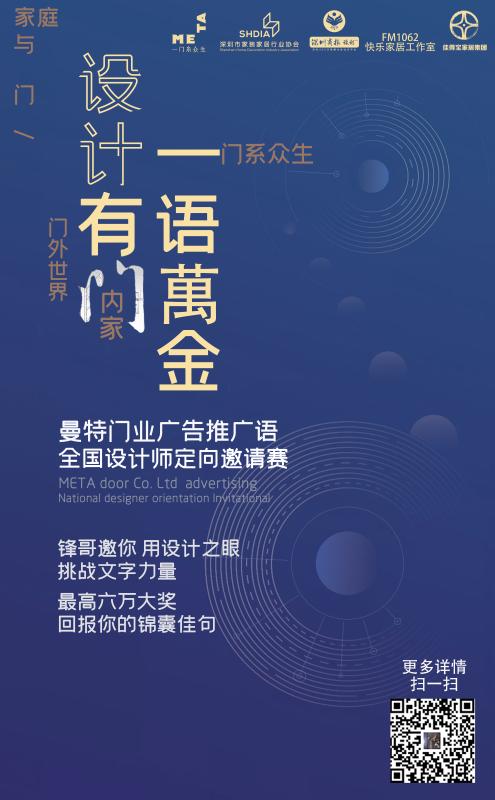 “設(shè)計(jì)有門,一語萬金”深圳市家裝家居行業(yè)協(xié)會、深圳商報(bào)、FM106.2《快樂家居》工作室聯(lián)手曼特門業(yè)舉辦的曼特門業(yè)廣告推廣語全國設(shè)計(jì)師定向邀請賽,在2020年1月1日正式啟動(dòng)啦。