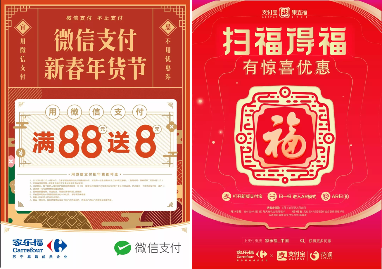 除此之外,各大支付平臺優(yōu)惠券亦開始發(fā)放,助力您的年貨采買。前方高能預(yù)警!1月13日至2月8日,顧客使用支付寶掃上圖“福”字以及參與集五?;顒樱从袡C會獲得家樂福全場滿200減10優(yōu)惠券。1月13日至1月30日,在家樂福使用微信支付消費滿80元,可獲得一張全場滿88元立減8元優(yōu)惠券,