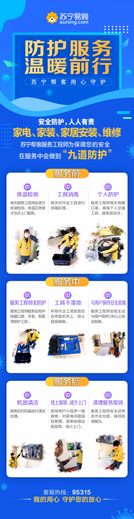 據(jù)悉,蘇寧家電“九道防護(hù)”措施涵蓋服務(wù)的前、中、后期全程。服務(wù)前,蘇寧服務(wù)工程師需進(jìn)行體溫檢測,衣物工具車輛消毒,同時(shí)佩戴口罩;服務(wù)過程中,需佩戴口罩、手套、鞋套等全套防護(hù)工具,并主動(dòng)與用戶保持2米的安全距離,避免直接接觸;服務(wù)完成后,對機(jī)器進(jìn)行清潔處理,同時(shí)指導(dǎo)用戶關(guān)注報(bào)修和故障求助,帶走作業(yè)垃圾。