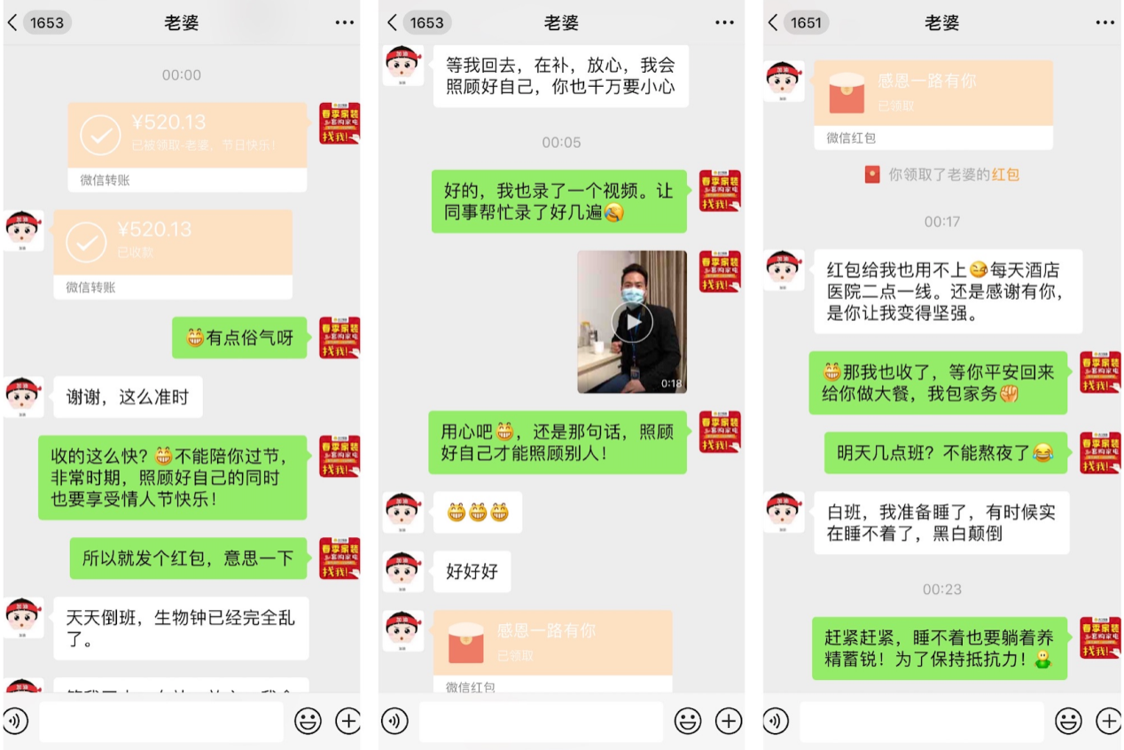 妻子也回贈了紅包,說:“感謝有你,是你讓我變得堅強。”盡管疫情讓他們相隔千里,但愛情始終連接著彼此的心。
