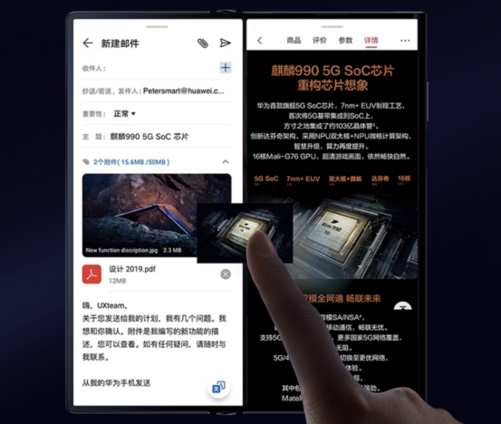 Mate Xs采用8英寸顯示屏,分辨率為2480×2200,折疊時,屏幕尺寸為6.6英寸,分辨率為2480×1440。展開狀態(tài)下,華為Mate Xs充分發(fā)揮突破視野的視覺空間優(yōu)勢,在瀏覽視頻、開啟閱讀、使用導(dǎo)航以及游戲影音時,將獲得前所未有的視覺極限與沉浸體驗。此外,通過智慧分屏模式,可以同時顯示、運行多個應(yīng)用程序,多窗口交互提升應(yīng)用體驗及操作效率。這種智慧分屏模式提供平行視界、跨屏拖拽、懸浮窗、分屏快捷欄等高頻使用場景智慧生態(tài)操作。