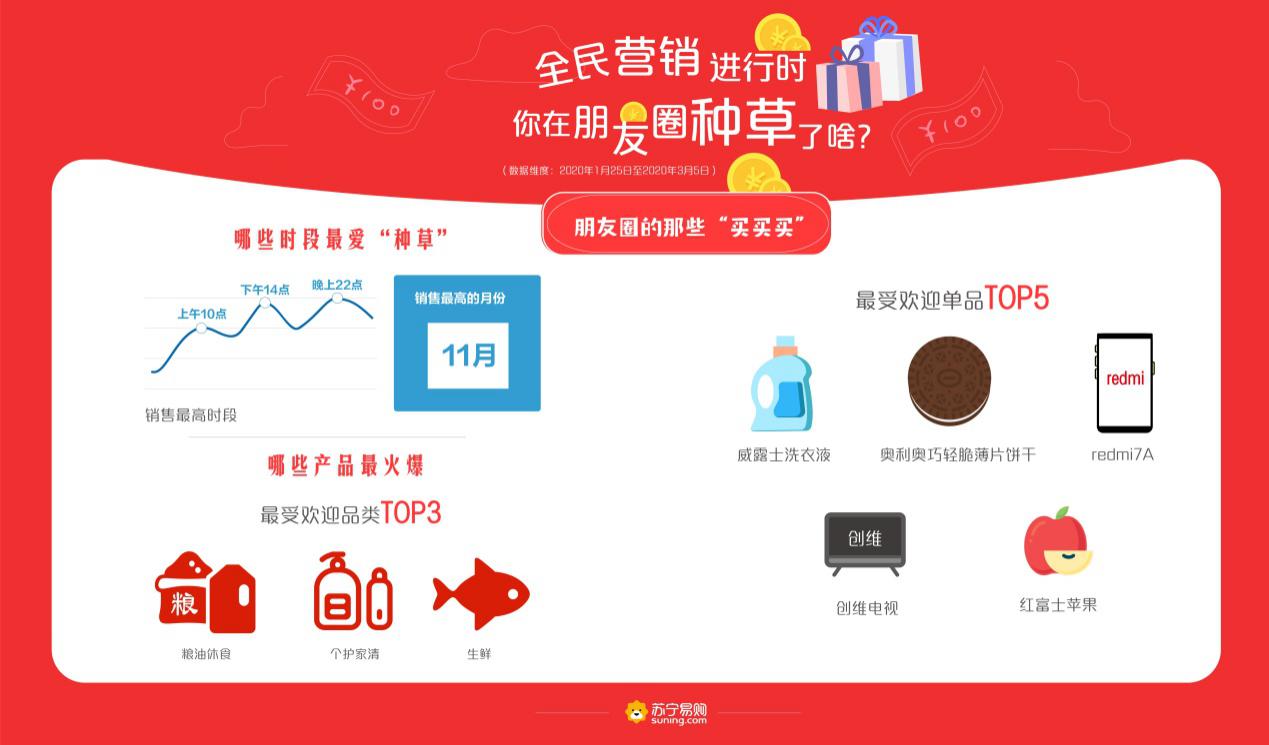 深圳新聞網(wǎng)2020年3月10日訊 線上買菜、線上看病、直播上課、遠程健身……“宅經(jīng)濟”爆發(fā),使得社群私域流量積累的能量進一步凸顯,全民營銷成為新風(fēng)口。近日,蘇寧易購發(fā)布全民營銷大數(shù)據(jù),2020年1月25日至3月5日,蘇寧推客買家數(shù)和賣家數(shù)分別突破千萬、百萬大關(guān),80后成為朋友圈買、賣“雙主力”,糧油休食、個護家清、生鮮等產(chǎn)品成為最受歡迎的消費品類。