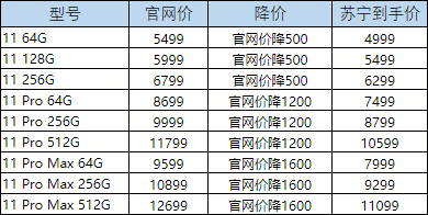目前在蘇寧易購官網(wǎng),iPhone11 Pro Max各型號全部降價1600元,最低7999元就能入手;iPhone11 Pro降價1200元,64G版本7499元;同時,iPhone11也降了500元,最低配64G版本售價4999元。此外,iPhone XR等上一代機型也有不同程度降價力度。