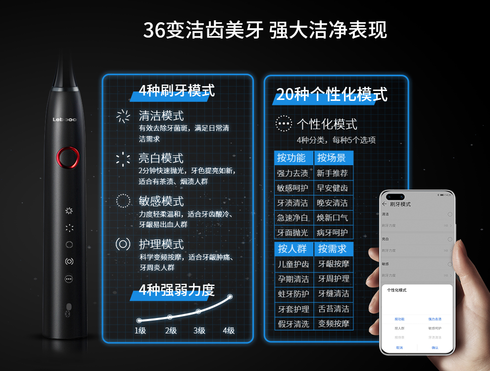 值得一提的是,力博得智能聲波牙刷·星鉆內置壓力傳感系統(tǒng),具有36種潔齒檔位,4種潔齒模式和4級力度調節(jié)。強勁清潔模式:滿足日常清潔需求;拋光亮白模式:適合追求亮白人士;溫和敏感模式:適合牙齦易出血人群;輕柔護理模式:為牙病問題而生,體貼入微。以上模式各有1-4級力度調節(jié),更加人性化。