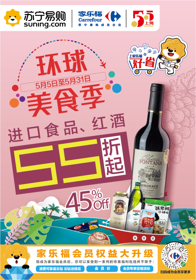 此外,家樂(lè)福方面還宣布將加大投入,全面支持上?!拔逦遒?gòu)物節(jié),全城打折季”。5月5日至31日,上海地區(qū)家樂(lè)福門(mén)店將開(kāi)啟“環(huán)球美食季”,精選來(lái)自法國(guó)、意大利、英國(guó)、西班牙、美國(guó)、加拿大、日本、韓國(guó)、馬來(lái)西亞等39個(gè)國(guó)家的350個(gè)品牌旗下共計(jì)3700多種進(jìn)口食品,與上海消費(fèi)者共襄盛舉。美食自然少不了美酒相伴,來(lái)自法國(guó)、意大利、西班牙、阿根廷、智利、澳洲等國(guó)家的70多個(gè)品牌旗下共計(jì)200多種進(jìn)口葡萄酒,也將悉數(shù)亮相全市家樂(lè)福門(mén)店?;顒?dòng)期間,進(jìn)口食品低至5.5折起,進(jìn)口紅酒買(mǎi)一送一。進(jìn)博會(huì)“同款”法國(guó)奧格斯汀系列葡萄酒也將首次參與促銷(xiāo),葡萄酒愛(ài)好者不容錯(cuò)過(guò)。