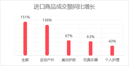 隨著人們生活水平的提升,進(jìn)口生鮮成交額同比增長(zhǎng)了151%。近幾年,進(jìn)口生鮮的價(jià)格門檻下降,尤其是進(jìn)口的奶制品、豬肉、牛肉的價(jià)格跟國(guó)產(chǎn)商品十分接近。此外,借助于品牌優(yōu)勢(shì),進(jìn)口的運(yùn)動(dòng)戶外、美妝護(hù)膚、玩具樂(lè)器、個(gè)人護(hù)理等商品的成交額同比增長(zhǎng)也比較高。