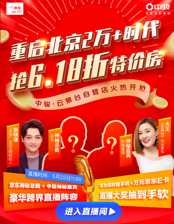 值得關(guān)注的是,中國(guó)內(nèi)地男演員張曉謙、奇葩說(shuō)選手大王、以及京東和中駿的兩位“神秘嘉賓”還將在5月22日上午11點(diǎn)帶來(lái)直播,在線預(yù)售全新房源,并將一套6.18折的特價(jià)房開展618抽獎(jiǎng)活動(dòng),優(yōu)惠后僅需一百多萬(wàn)元即可拿下一套北京新房。