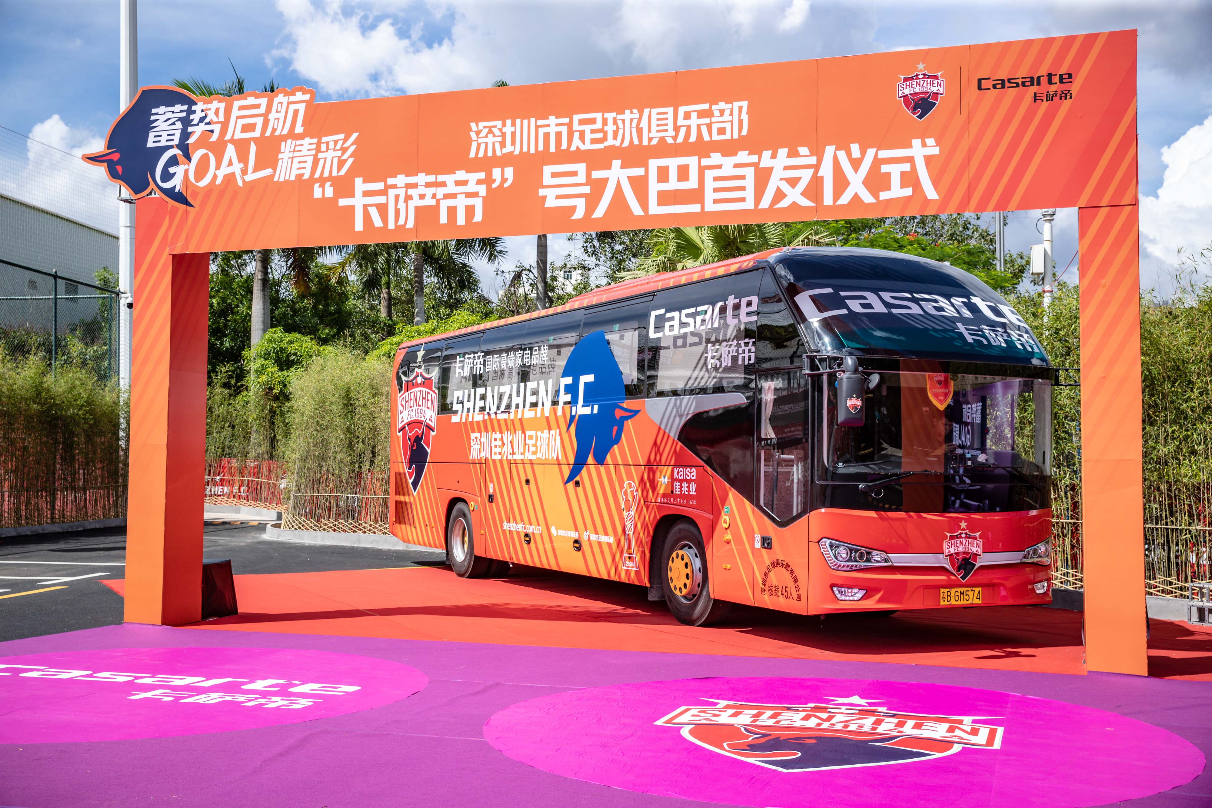 在交車儀式上,新大巴自然是當之無愧的主角。深圳佳兆業(yè)隊此次全新投入使用的大巴,外觀設(shè)計結(jié)合了深足+卡薩帝(Casarte)元素。大巴以橙色為底色,印有Casarte卡薩帝和深圳佳兆業(yè)足球隊的字樣,并在車身顯眼處印有深足LOGO。整車采用空氣動力學造型,現(xiàn)代感和運動感十足,是全新一代的高端公路客車產(chǎn)品。