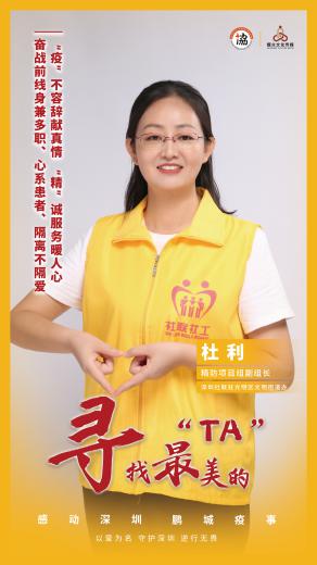 深圳社聯(lián)派駐光明區(qū)光明街道精防社工杜利,在一線戰(zhàn)疫中身兼多職、心系患者、隔離不隔愛。她不僅在深圳新冠肺炎確診數(shù)直線上升的敏感期,挺身而出主動為康復(fù)者親赴醫(yī)院領(lǐng)藥并送“愛”上門;白天更是積極開展社區(qū)巡查,幫助服務(wù)對象積極面對疫情;晚上再與防疫人員輪班值守、外出巡防,督促商戶們做好防護工作。